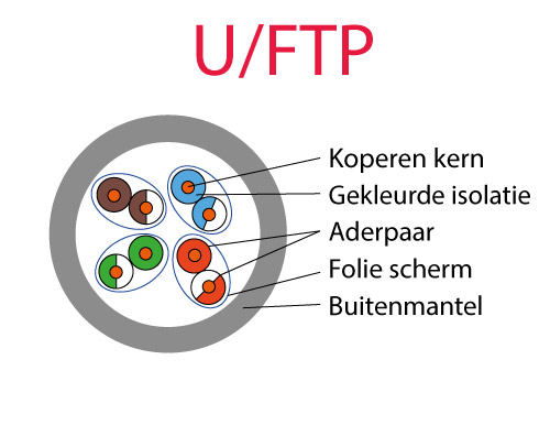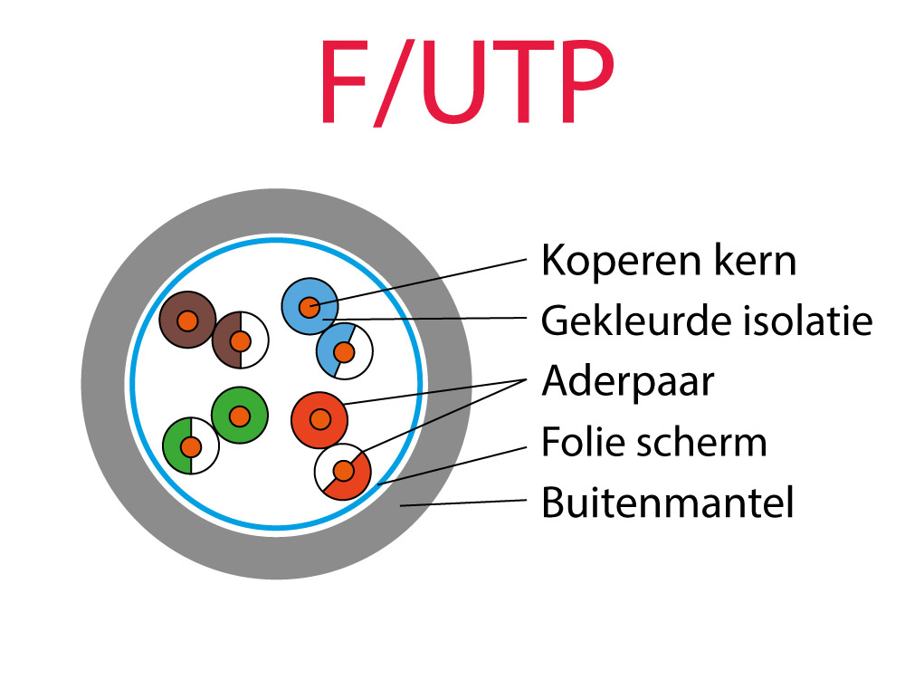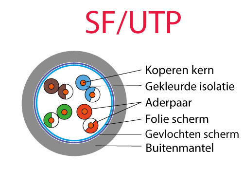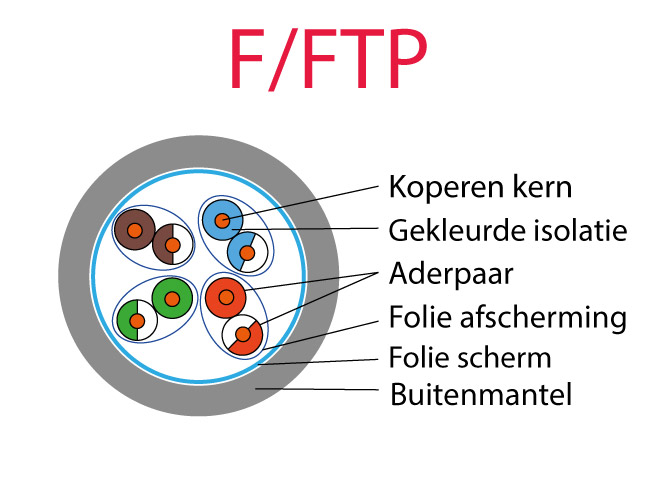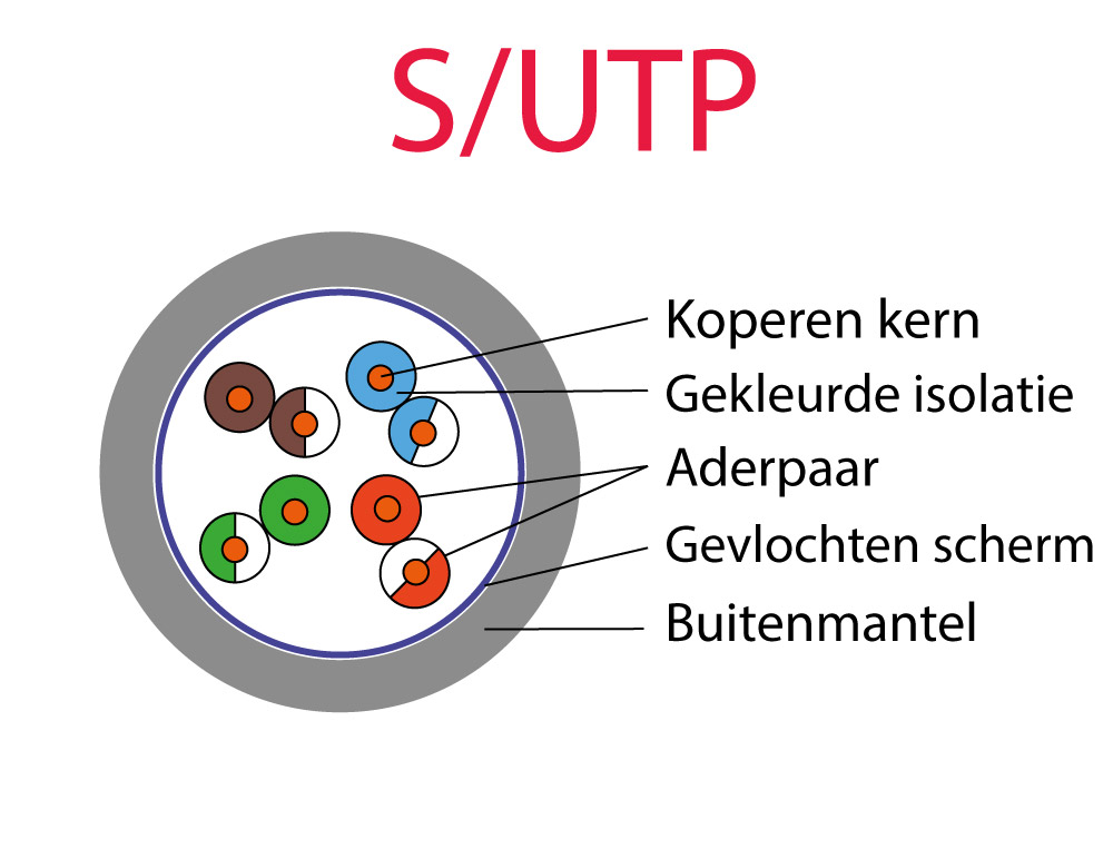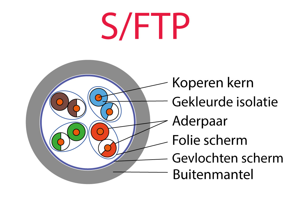 Want hoe meer interferentie (veroorzaakt door storingsbronnen), hoe beter een kabel (of de voorziening waar de kabel in komt te liggen) afgeschermd dient te zijn. Denk aan kabeltracé’s met scheidingsschoten of stalen buizen waar de datakabel doorheen gelegd kan worden. In die gevallen komen we op een S/FTP kabel. Bijvoorbeeld de Cat7a/Fa, S/FTP Datakabel van Datwyler.