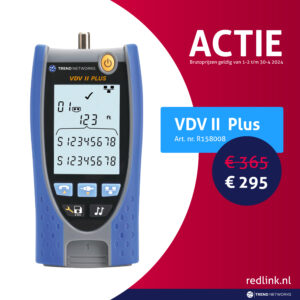 VDV II Plus (R158008): Alle functionaliteiten van de VDV II, aangevuld met een groter, verlicht display, detectie van kabellengte, HUB Blink functie voor poort identificatie op de switch en afstand tot open.
