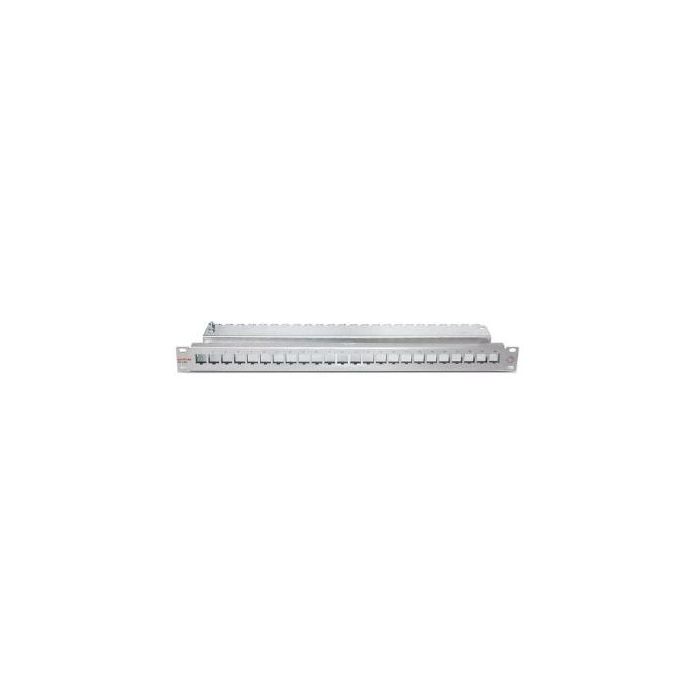 19inch / 1U stalen patchpaneel. Voorkant in roestvast staal of licht grijs, gelijkaardig aan RAL 7035. Voorkant bedruk met nummers 1 tot 24. Aansluitmogelijkheid van potentiaalvereffening. Levering zonder modules.