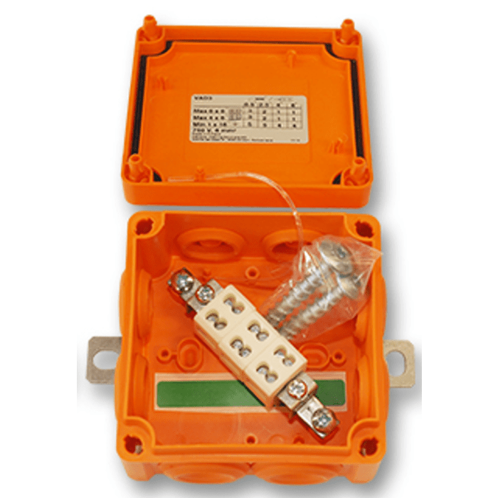 Junction Box VAD ... E30-E90 orange, 100x100x50mm, 3x KR6.4 + 2x PE 16 mm2, VAD 3 3x6 PE plus