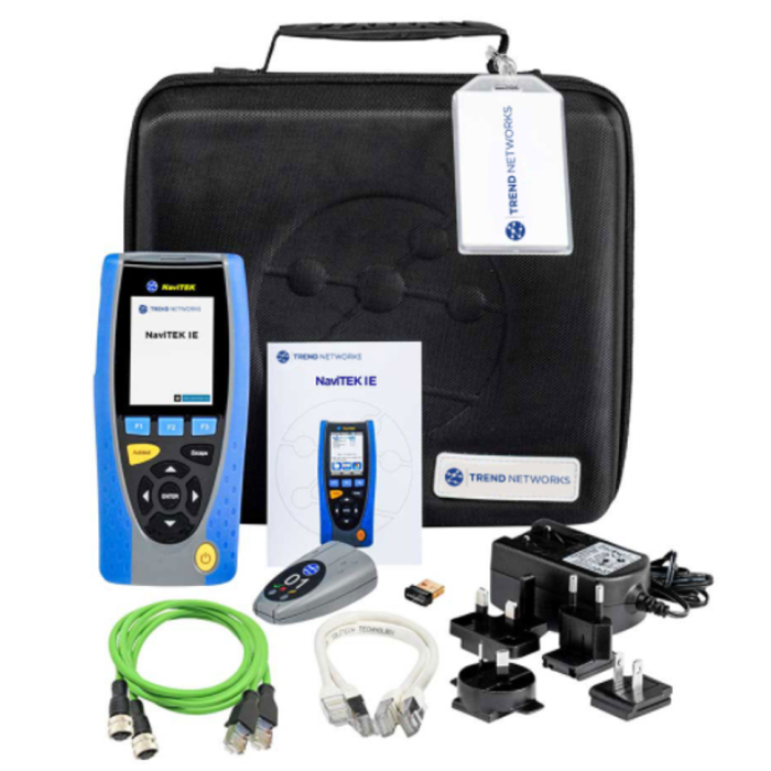 1 x NaviTEK IE test unit, 1 x Remote unit No. 1, 1 x Rechargeable Power Module, 1 x PSU EU/UK/US adapters, 2 x Patch cables - 30cm, Cat. 5e STP, USB Wi-Fi adapter, 1 x Quick reference guide, 1 x Carry case, 2 x PROFINET RJ45 (m) - M12 (f) D coded 1m adapter cable (R151058)