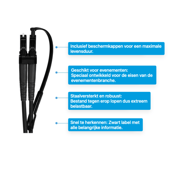Dankzij de robuuste en trapvaste constructie is de kabel uitermate duurzaam en biedt hij maximale bescherming, zelfs onder zware omstandigheden. Elke kabel is voorzien van stofbeschermkappen en een zwart label met informatie over lengte, vezeltype en connector.